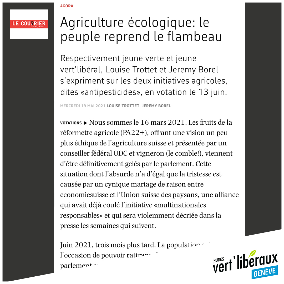 Retrouve dans le journal Le Courrier les arguments de notre ancien secrétaire @jeremyborel_27 et de la Jeune Verte @louisetrottet en faveur d’un double OUI aux initiatives dites « antipesticides ».
