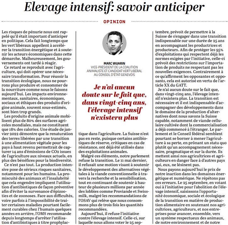Selon Marc Wuarin, candidat vert’libéral au Conseil d’État et vice-président de la Coalition animaliste, « saisissons l’opportunité économique, sociale et écologique de la transition en soutenant nos agricultrices, agriculteurs, et nos entreprises pour avancer vers un système respectueux des animaux, de notre environnement et de notre santé».