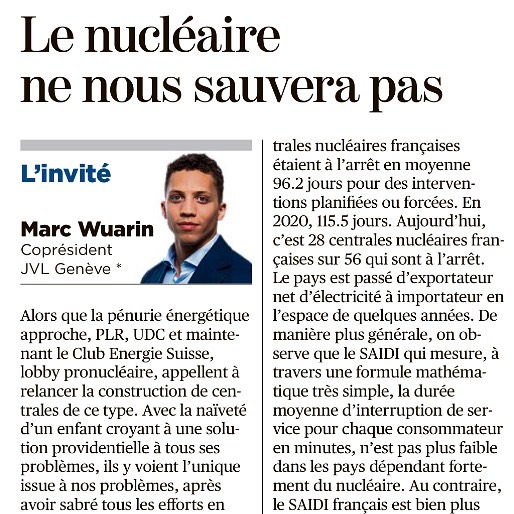 L’opinion complète de Marc Wuarin est à lire sur : www.tdg.ch/le-nucleaire-ne-nous-sauvera-pas-811113668146
